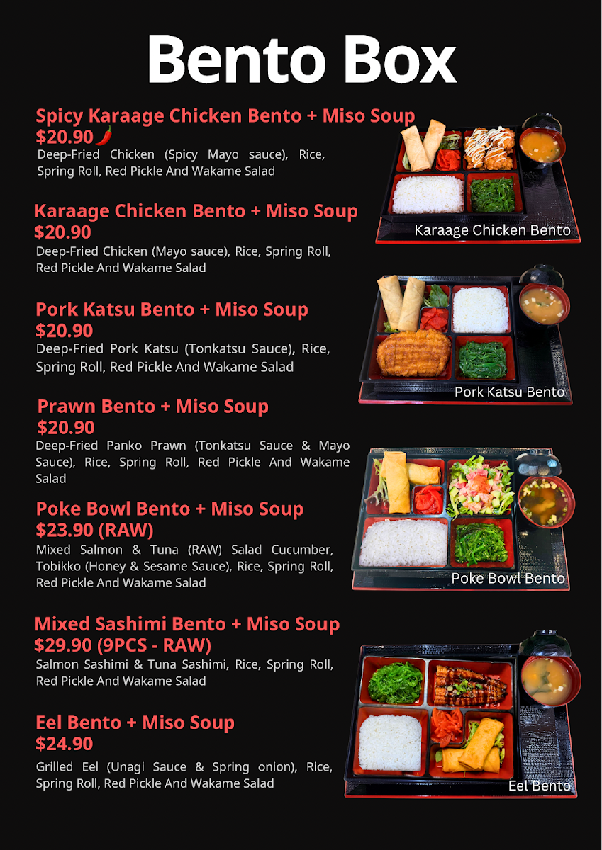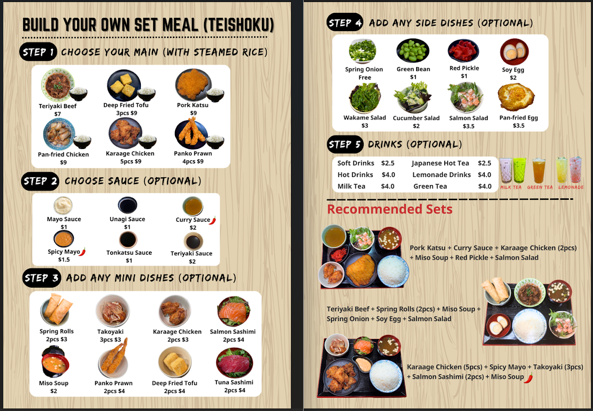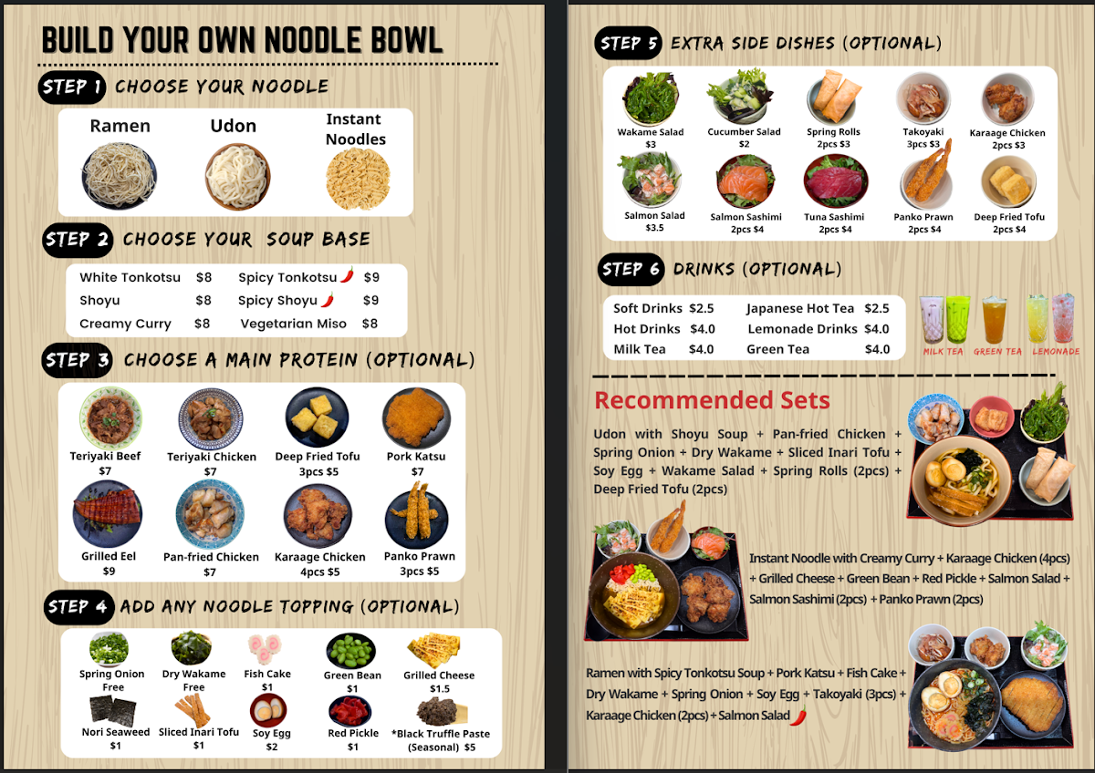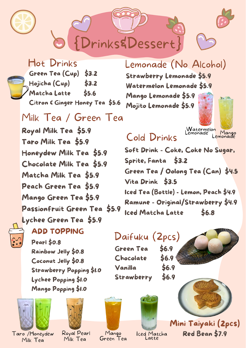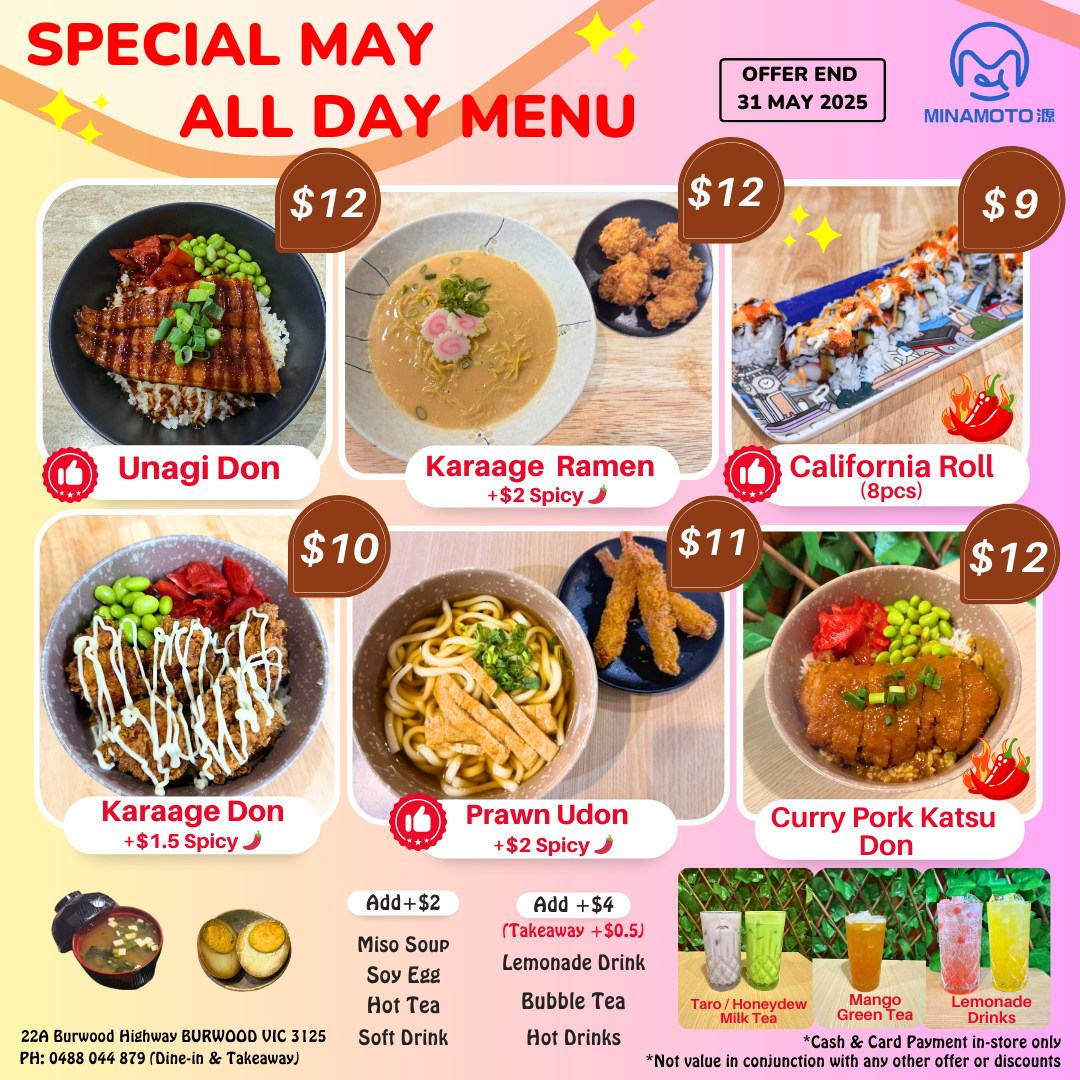 Minamoto Japanese Restaurant offers a diverse and flavorful menu with something for everyone. For those seeking a light start, the Prawn Salad, Karaage Salad, and Tofu Salad are fresh and satisfying options. The family meals include the 2 People Set and the 1 People Set, perfect for sharing. When it comes to entrees, you can enjoy dishes like Fried Pork Katsu with Curry Sauce, Spicy Karaage with Unagi Sauce, and Grilled Eel for a savory experience. For something heartier, the Prawn Ramen, Curry Karaage Chicken Udon, and Teriyaki Wagyu Beef Ramen are all excellent choices, while Karaage Udon and Tofu Udon provide lighter, yet equally delicious, alternatives. The Spicy Karaage Don and Pork Katsu Don are standout options in the don section, and the Teriyaki Beef Bento and Karaage Bento offer a quick, satisfying meal. To finish on a sweet note, the Japanese Chocolate Shortcake, Mango Daifuku (2pcs), and Hojicha Cheesecake provide delightful dessert choices. Complement your meal with refreshing beverages like Peach Green Tea, Honey Citron Ginger Green Tea, or indulge in a Royal Milk Tea or Chocolate Milk Tea. Whether you're in the mood for a light bite or a more filling meal, Minamoto’s menu brings the best of Japanese cuisine with a variety of fresh, flavorful dishes.